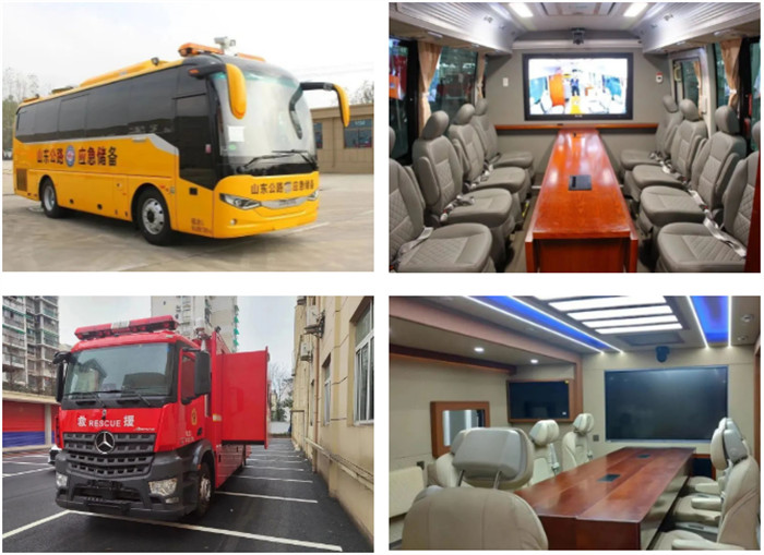 車廂整體分為設備區、會議辦公區、生活設施區。其中會議區可配備長座椅、會議桌,以及多功能接口、影音、照明燈等附屬設施。顯浩指揮車可為搶險救援、森林防火、公安偵查等現場的科學指揮決策提供堅強有力的指揮通信保障。
