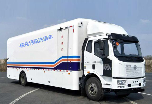 我軍裝備的核化污染洗消車,采用卡底盤改裝。裝備防化兵部隊,是我軍防化兵主要的洗消裝備之一。軍綠色迷彩涂裝,底盤后裝載的大型廂體內,是各種專用大型噴灑、洗消設備和核生化防護裝備。無須專人在車輛上控制。洗消作業防化兵,在遭遇核生化武器攻擊,形成染毒地帶后,就迅速從車上取下并穿戴個人防護裝備,開啟廂體內的設備,進行洗消。