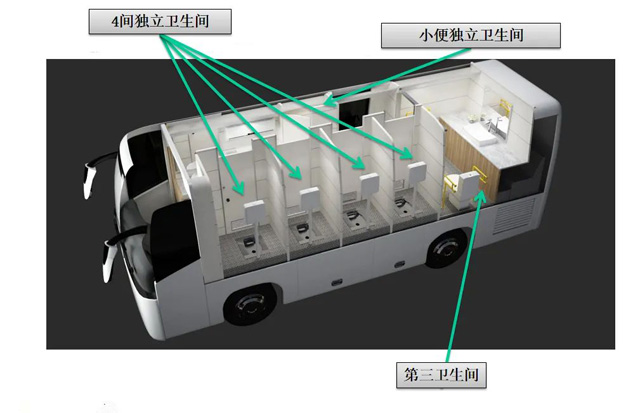 各類大型會展、賽事、文娛活動保障往往有突發較大的如廁需求。后勤保障車整車長12米,寬2.55米,高3.6米,內高大于等于1.9米。司機區域獨立,有兩個座位,配備獨立空調。是真空型環保廁所是用于人員大小便的專用作業車。搭載馬桶、蹲便器、洗手池等專用裝備,既相互獨立,又互相關聯。可提供5人同時入廁使用。利用真空將便器內的污物抽吸到真空泵,經粉碎后,再將污物輸送到污物箱,同時吸附異味,使整個廁所干凈、整潔、移動方便。滿足多人如廁的需求,且無需外接水電,方便現場保潔。精準到位,快速保障,有效降低了人力和時間成本,提高了使用效率。取消原車風道,降低平地板,增加了原有使用空間,整車根據不同功能需求分區布局,充分采用新技術,滿足人們對生活品質的追求;節約資源,轉場效率高。滿足人們的如廁需求。大大節省了傳統廁所建設的人力、物力財力。