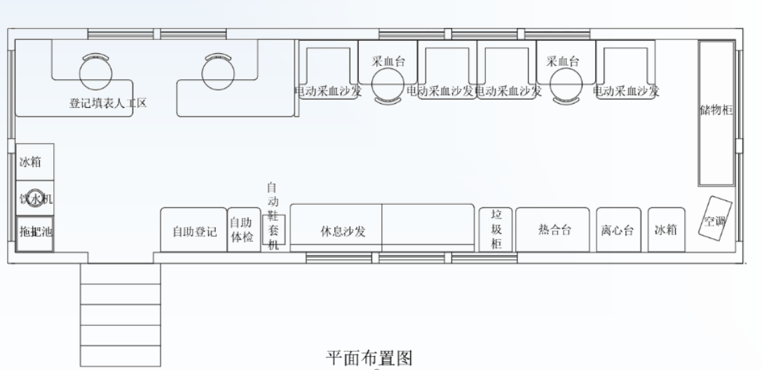 獻血屋由骨架、外蒙鋼板、隔溫層、鋁塑板、中空鋼化玻璃窗、防盜門、底盤、外墻、內部裝修、醫療設備等結構組成。面積比較大,內部設置嚴格按照采血流程要求,包括獻血征詢區、體檢區、快速檢測區、獻血等候區、采血區、和休息區。配備的設備滿足血液儲存,試劑儲存,電子血壓計,血紅蛋白儀,細胞分離機等醫療廢物存放設施,獻血者可在休息區觀看電視節目和進行娛樂活動,是一所現代化的愛心獻血屋。